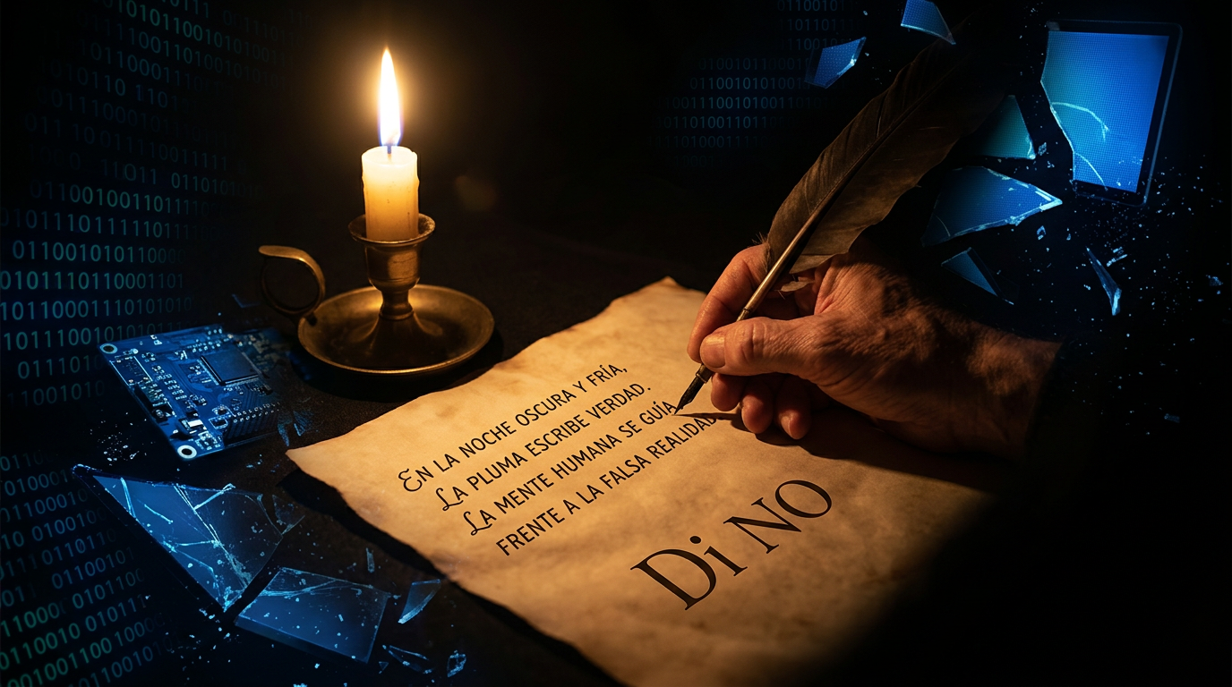 Uno de los hallazgos más claros de la monografía es la demostración de que el clasicismo métrico no contradice la postura anti-IA sino que la refuerza. Escribir un soneto endecasílabo con rima consonante petrarquista en 2026 es, dice García Pérez-Tomás, «el acto performativo más eficaz del rechazo de la IA»: requiere escansión silábica, gestión de patrones acentuales, control de la sintaxis dentro de los límites estróficos, elaboración de un argumento con estructura bimembre. Es decir, requiere exactamente el tipo de atención sostenida y específicamente humana que la IA amenaza con sustituir. La forma es el argumento. No como metáfora, sino literalmente: hacer el soneto es demostrar que se puede hacer el soneto.